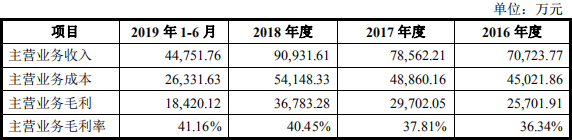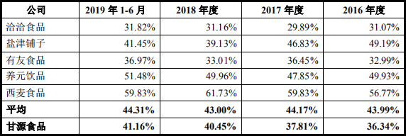 2016年至2019年1-6月,甘源食品主营业务毛利率分别为36.34%、37.81%、40.45%、41.16%;行业均值分别为43.99%、44.17%、43.00%、44.31%。