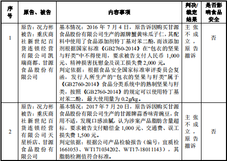 招股书显示,甘源食品存在两项食品安全诉讼事项,公司均为被告。