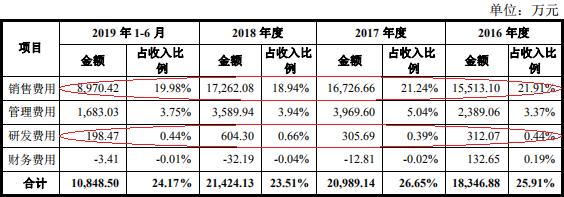 2016年至2019年1-6月,甘源食品研发费用分别为312.07万元、305.69万元、604.30万元、198.47万元;占收入比例分别为0.44%、0.39%、0.66%、0.44%。