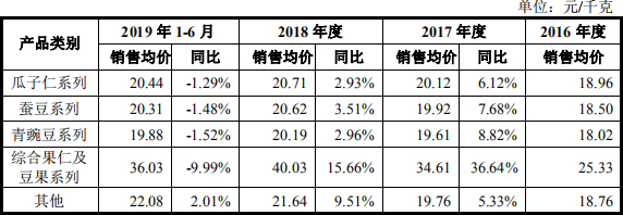 2016年至2019年1-6月,甘源食品瓜子仁系列产品平均销售价格分别为18.96元/千克、20.12元/千克、20.71元/千克、20.44元/千克;蚕豆系列产品平均销售价格分别为18.50元/千克、19.92元/千克、20.62元/千克、20.31元/千克;青豌豆系列产品平均销售价格分别为18.02元/千克、19.61元/千克、20.19元/千克、19.88元/千克;综合果仁及豆果系列产品平均销售价格分别为25.33元/千克、34.61元/千克、40.03元/千克、36.03元/千克;其他产品平均销售价格分别为18.76元/千克、19.76元/千克、21.64元/千克、22.08元/千克。