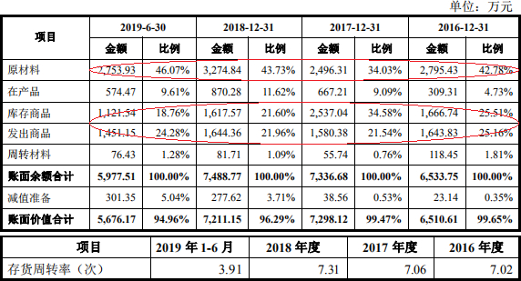 2016年至2019年1-6月,甘源食品存货账面余额分别为6533.75万元、7336.68万元、7488.77万元、5977.51万元;存货周转率分别为7.02次、7.06次、7.31次、3.91次。