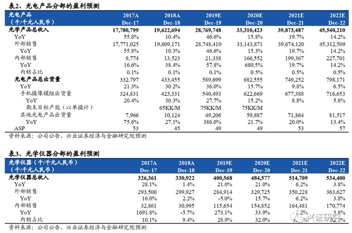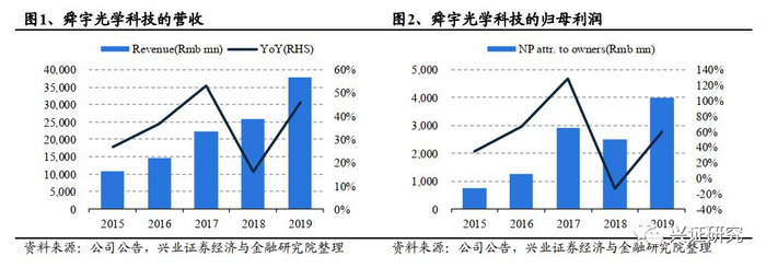 三大业务毛利率均改善,带动利润增长超预期。公司2019年收入378亿(人民币,下同)(+46.0%),归母净利润40亿(+60.2%);毛利率20.5%,净利润率10.6%。其中,光学零件收入88亿(+46.4%),毛利率45.2%(+3.7ppts);光电产品收入116.8亿(+27.1%),毛利率9.3%(+0.9ppts);光学仪器收入2.8亿,毛利率41.3%(+0.8ppts)。