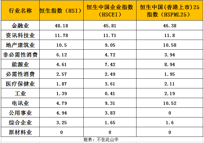 可见,三个指数的金融占比都是非常高的,且不相上下,其次是资讯科技业。