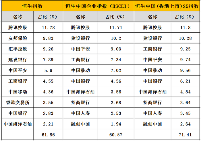 可以看出,这3个指数是非常类似的,尤其是恒生国企指数和恒生25指数,前十大流通股一模一样,只不过由于恒生25指数成分股只有25只,因此前十大持仓更为集中。而恒生指数前十大与国企指数主要区别在于加入了友邦保险、汇丰控股以及香港交易所这三个香港本地股。