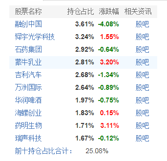 前十大流通股及占比分别为:融创中国、舜宇光学科技、石药集团、蒙牛乳业、万洲国际、吉利汽车、海螺创业、药明生物、华润啤酒、中芯国际。前十大没有具体的占比,只能看基金了。