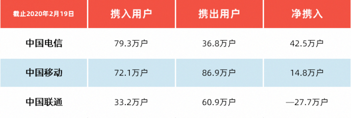 在4G年代,中国联通已经没有了3G时代快速的增长量,并且用户数量还有倒退的现象。2019年11月份开始的携号转网服务上线以来,运营商财经网公布了一份三大运营商携号转网的最新数据,统计时间为2019年11月10日到2020年2月19日。