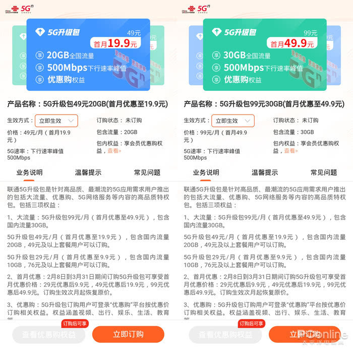 在3月31日前订购该升级包可以想享受首月优惠价,优惠后分别是9.9元、19.9元、49.9元,次月恢复原价。需要注意的是,5G升级包不是套餐,并不会与当前4G套餐有冲突,仅在5G流量之外在增加5G流量包。所以反过来说,已经开通了5G套餐的用户,也不能享受这个福利。另外,开通之后随时也可以取消,次月生效。