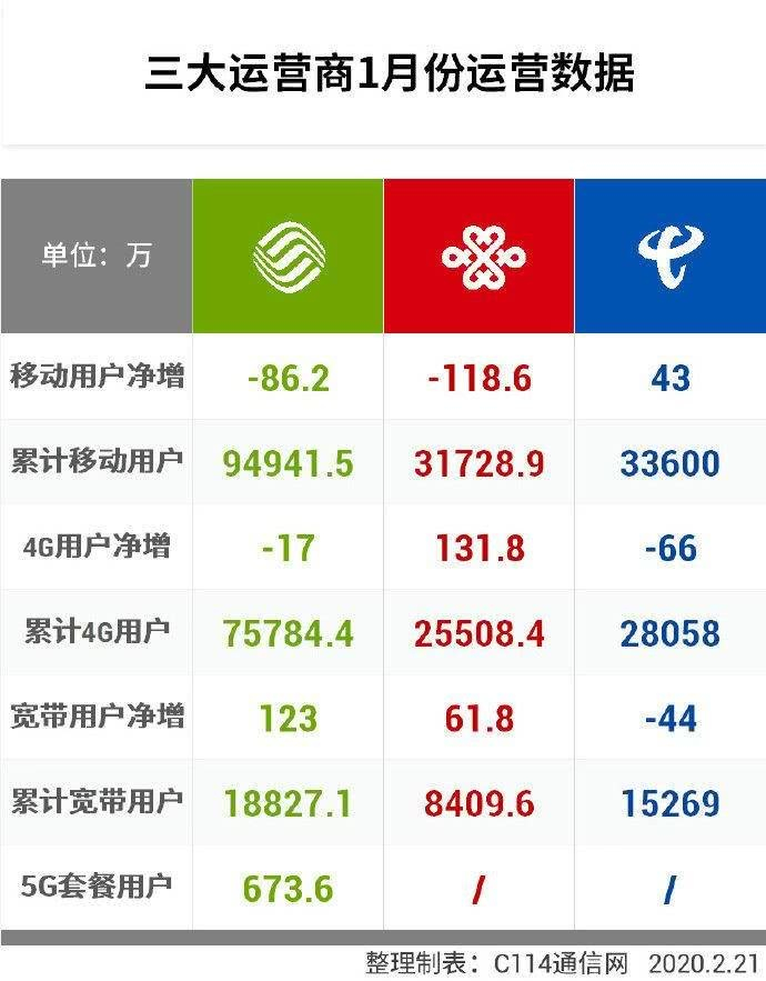 2020年2月21日,据C114通信网统计的三大运营商1月份运营数据显示,中国移动用户已达94941.5万户,已经是中国联通的三倍之多。中国电信移动用户量也比中国联通多了近2000万户,达到33600万户。用户数量倒退已经是三家运营商中最快,中国联通怎能不心急呢?