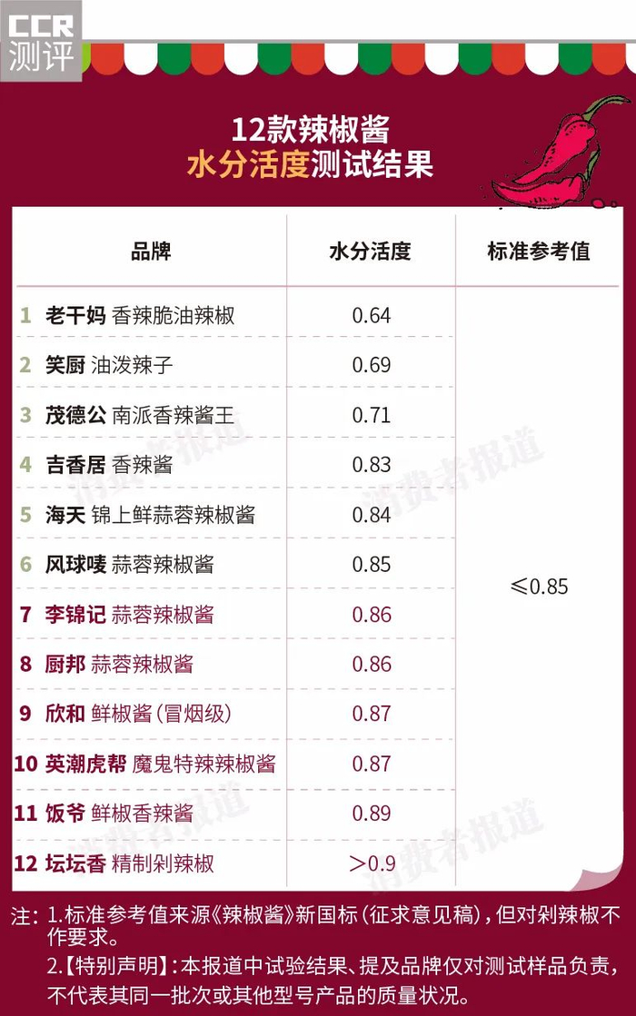 测试结果显示,饭爷、欣和、厨邦等5款的水分活度高出了《辣椒酱》(征求意见稿)的规定限值≤0.85。