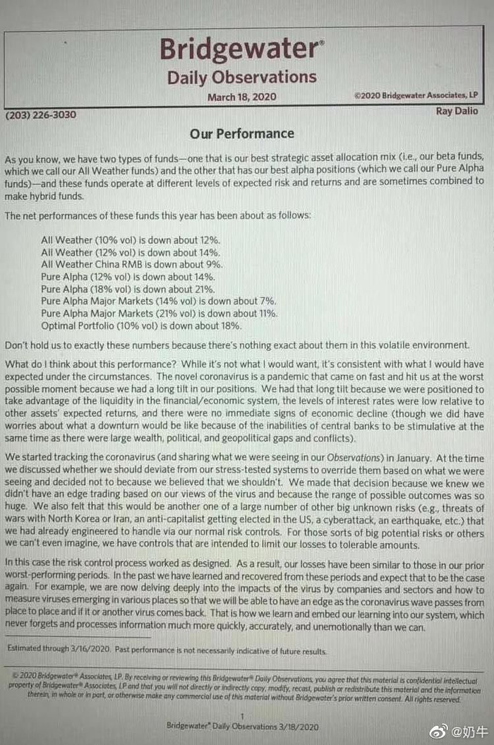 随后,一份桥水的3月18日的每日观察也外流,这份观察中,还披露了桥水期间基金今年截至3月18日的表现: