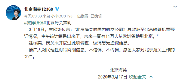 3月17日一早,“北京海关12360”官方微博发表辟谣声明: