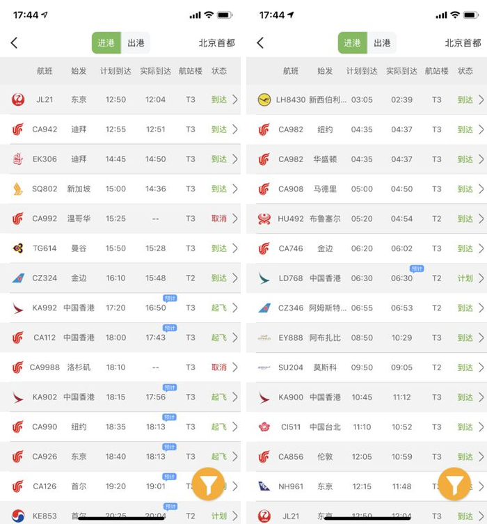 根据中航信旗下航旅纵横数据,《中国经济周刊》记者统计了3月17日全天,在北京首都国际机场运行的全部93家航空公司(22家境内航空公司,71家境外公司)国际进港航班信息。