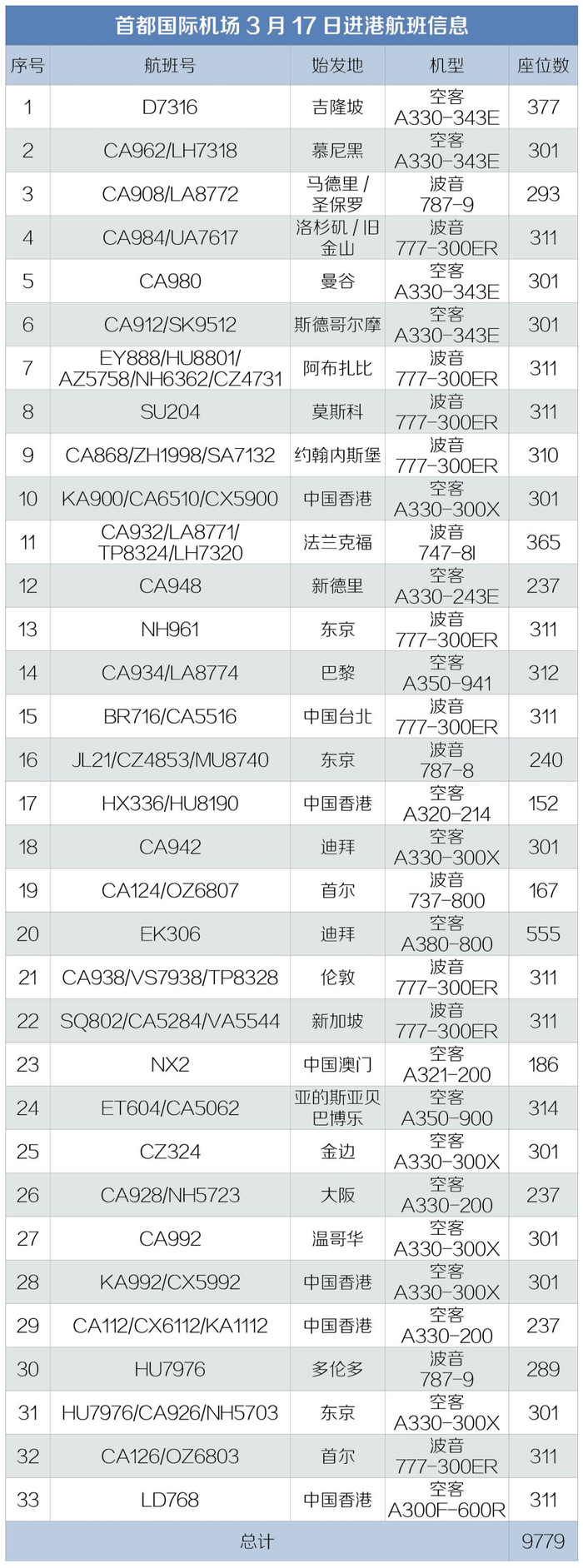 也就是说,3月17日全天的实际运力达到9779人,如按当天的运力满负荷载客,北京的国际进港人数最高可达9779人。