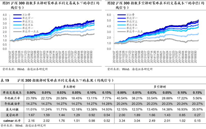 我们以20日均线信号择时策略为例,考察策略对交易成本的敏感性,如以下图表所示。其中,多空择时对交易成本较为敏感,多头择时对交易成本敏感性较低。