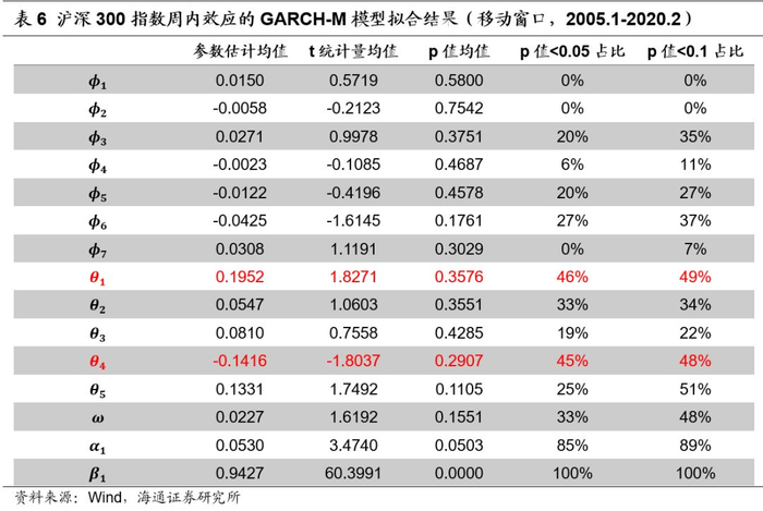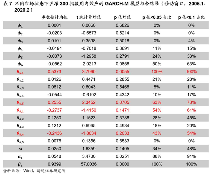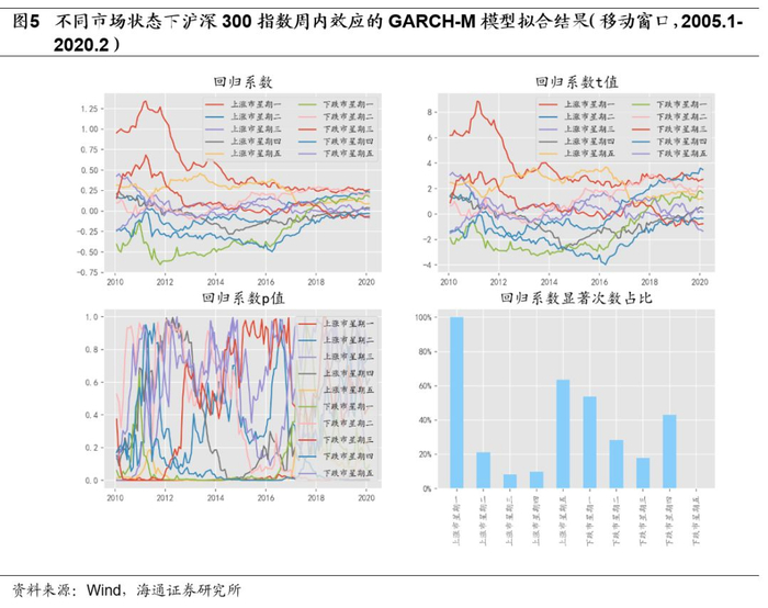 不同市场状态下沪深300指数周内效应的移动窗口GARCH-M模型拟合结果如以下图表所示。