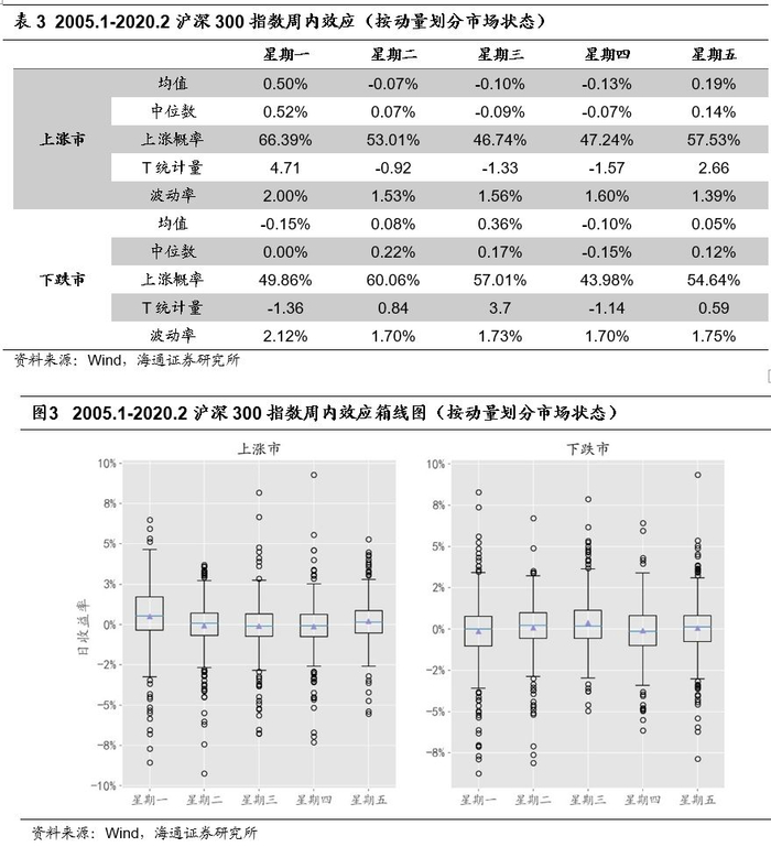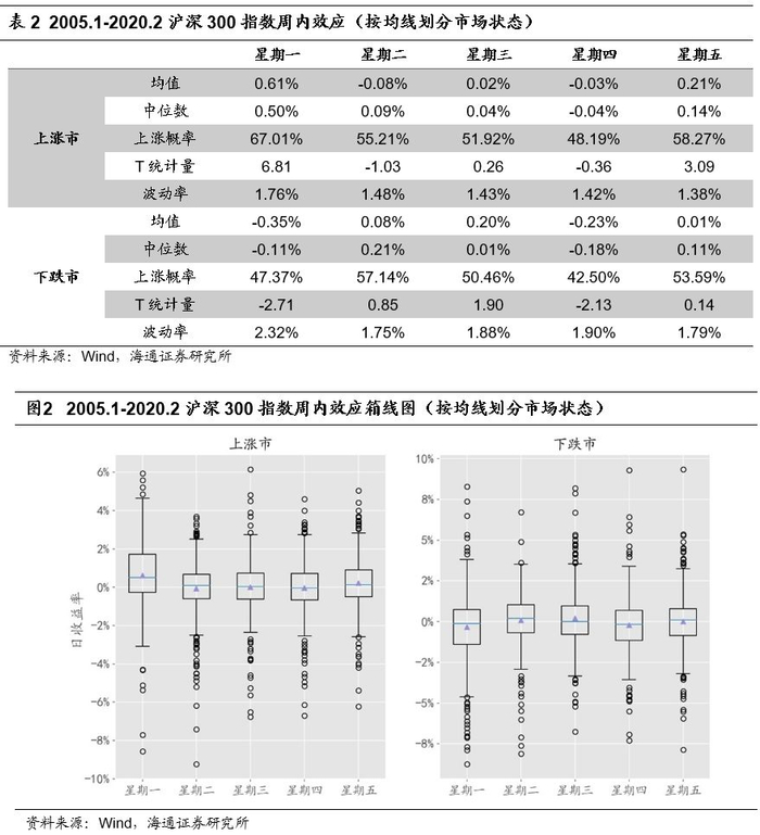 下跌市中,星期一和星期四的收益均值分别为-0.15%和-0.10%,但均不显著为负,而周三的收益率显著为正,均值和上涨概率分别为0.36%和57%。