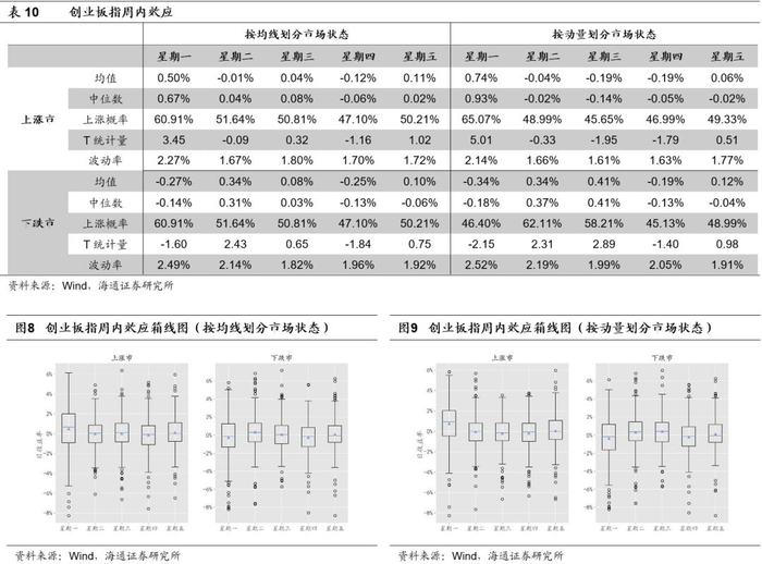 下跌市中,周一的收益率显著为负,均值仅为-0.35%,上涨概率为47.37%,周四的收益率也显著为负,均值为-0.23%,上涨概率为42.50%。此外,周三的收益率在10%的水平下显著为正,均值为0.20%。