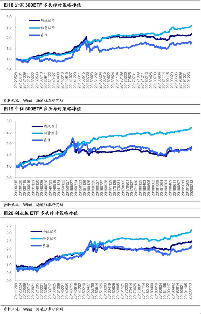 ETF回测标的分别为沪深300ETF(510300.SH)、中证500ETF(510500.SH)和创业板ETF(159915.SZ),仅考虑单向做多,交易成本设为单边万分之三,按单利计算收益。