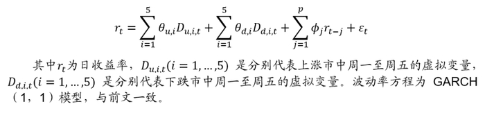 一些研究表明,月内效应、日历效应等异象仅仅是源于数据挖掘和样本选择问题。我们在本节中将使用移动窗口下的GARCH-M模型来检验在之前的无条件检验中所存在的周内效应。