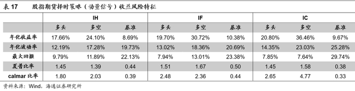 策略表现如下图所示,其中动量信号下的择时策略表现较好,IF、IH和IC择时的多空年化收益率分别为30.72%、24.10%和36.46%,夏普比率分别为1.67、1.39和1.58,calmar比率分别为2.36、2.03和4.77。