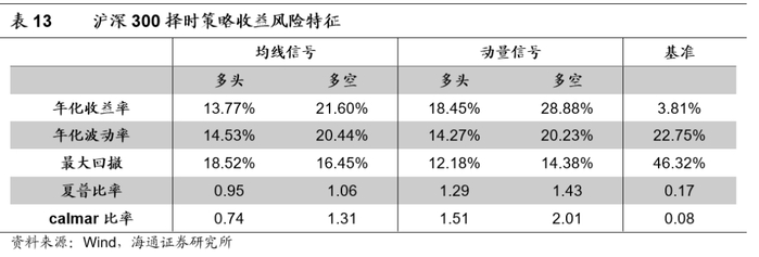 复合策略自2010年以来的表现如下图所示。均线信号下的沪深300择时策略年化多空收益率为21.60%,夏普比率和calmar比率分别为0.95和0.74。动量信号下的择时策略年化多空收益率为28.88%,夏普比率和calmar比率分别为1.43和2.01,表现相对更优。