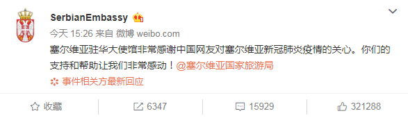 20分钟后,大使馆发布第二条微博,写道:“非常感谢中国网友对塞尔维亚新冠肺炎疫情的关心。你们的支持和帮助让我们非常感动!”