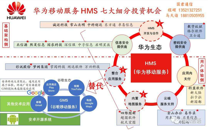 国泰君安建议,从七大细分领域关注华为HMS带来的投资机会,包括HMS开发逾合作、信息安全提供商、整合应用服务商、内置地图服务、云端服务支持、应用内支付、密码安全提供商等。