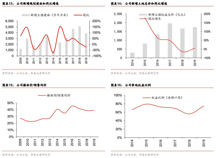2019年万科新增项目总建面约3716.5万平方米,同比-26.7%,权益规划建筑面积2478.4万平方米,同比-16.5%,权益地价总额约1549.6亿元,同比-6.6%。虽然整体扩张体量有所收缩,但公司在权益比例以及扩张节奏上呈现逆周期属性。2019年新增土储权益占比由2018年的56%提升至75%,同时,公司在节奏上也是从融资趋紧的5月开始逐渐转向积极拓展。正因审慎的扩储原则下,平均楼面价控制在6252元/平方米的水平,占销售均价比重为39%,与18年基本持平,维持16年以来相对低位。
