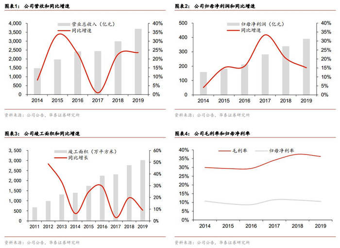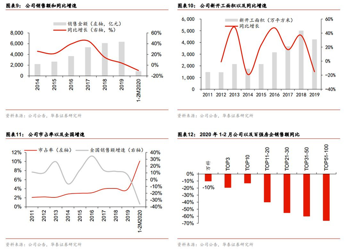 2019年销售额6308.4亿元,同比+4.0%。新开工面积同比-15.1%,展望2020年,我们认为万科市占率有进一步增长的潜力。首先,整体储备相对充沛;其次,万科往往在逆势下有优于全市场的表现。2020年1-2月,万科销售额达829.4亿元,市占率高达10.1%,同比+2.9PCT。尽管疫情影响,但公司深耕能力出众,我们预计2020全年有望保持稳健。