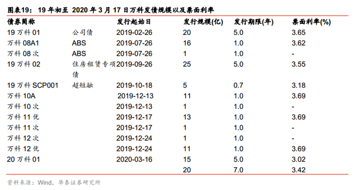 2019年净负债率为33.9%,同比上升8.9PCT,但依然处于行业低位,短债覆盖率173.1%。发行境内债约85亿,平均利率约3.60%;2020年融资优势进一步凸显,2020年3月成功发行25亿公司债,利率3.02%-3.42%,其中5年期利率同比-63BP,同时万科还具备港股增发的平台优势。低杠杆的债务结构以及占优的融资成本,利于公司把握土地市场和收并购机遇。