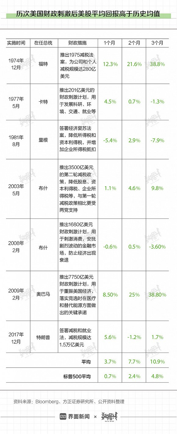 方正证券指出,历史上“美国股市大跌-美国经济衰退-财政刺激出台”的组合曾多次出现,大规模财政刺激支撑美股重拾上涨势头。