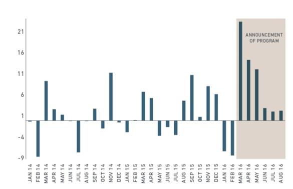 公司债购买计划(CBPS)2016/8/4至今100亿英镑降低公司债收益率和企业举债成本