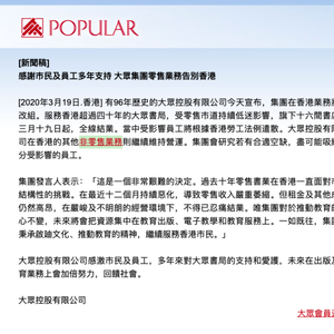 香港大众书局于2020年3月19日在其官方网站宣布:“服务香港超过四十年的大众书局,受零售巿道持续低迷影响,旗下16间书店由3月19日起,全线结业。”
