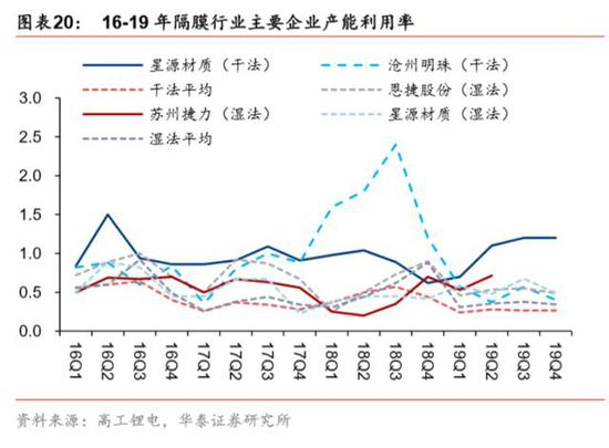 隔膜:根据高工锂电披露,16-19 年干法/湿法隔膜平均产能利用率分别为 20%-60%、 30%-90%,每年 Q1 为产能利用率最低点,其中干法隔膜供给弹性明显,星源材质(16Q2)、 沧州明珠(18 年)产能利用率远超 100%,恩捷股份利用率高于行业平均水平。