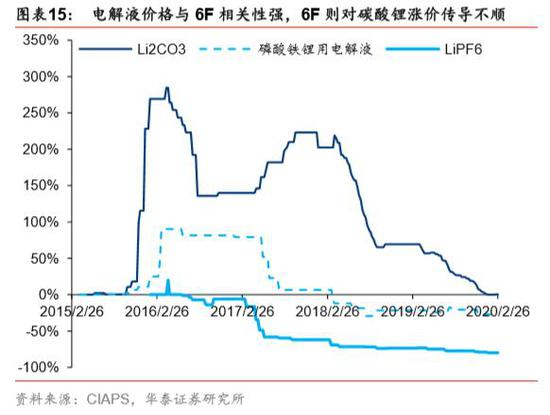 正极材料、电解液的成本差异主要取决于核心原材料成本。以三元材料 NCM523 为例, 其产品价格走势基本与碳酸锂、硫酸钴等核心上游原料的价格走势一致,且与硫酸钴的相 关性更强。电解液产品价格则与六氟磷酸锂(以下简称 6F)价格密切相关,6F 的价格与 其原材料碳酸锂的价格走势在2017年4月底发生背离,6F生产企业的盈利能力严重下滑, 直至 18Q2 后重新同步。