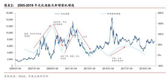 2005-2019 年光伏行业复盘。光伏行业的发展共分为四个阶段:1)2008 年以前德国、西 班牙等国家通过补贴等方式进行刺激,新增装机增速在 08 年初达到 150%; 2)2008-2012 年先后经历金融危机、德国/意大利抢装、欧洲双反等,行业装机增速大幅波动;3) 2013-2017 年成本下降促进应用场景丰富,行业进入稳定增长期,2017 年中国分布式爆 发;4)2018 年政策急刹车,行业进入整顿期;5)2019 年组件下降激发海外市场需求, 国内市场恢复增长。受新增装机增速大幅波动影响,相关指数大幅震荡。