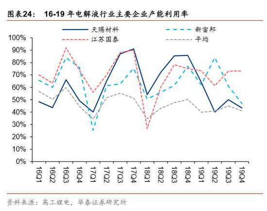 电解液:16-19 年行业平均产能利用率 40%-60%,与电池类似,企业生产/库存也呈显著 季节性特点,17-18 年产能利用率高峰相较电池滞后一个季度,即 Q4 是全年高点。行业 前三名天赐材料、新宙邦、江苏国泰均高出行业平均水平。