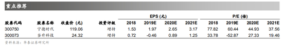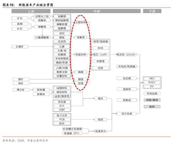 中游产业链中,动力电池的价值量最高,市场空间最大,马太效应最显著。材料环节中,值得关注的是走差异化路线的标的(比如高镍三元材料、新配方电解液)。根据成长性、天花板、集中度、全球化四指标,并结合估值水平,建议关注相对确定行业龙头和估值修复两条主线。推荐宁德时代、当升科技,关注璞泰来、天赐材料、嘉元科技、三花智控和先导智能。
