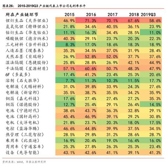 4)2019 年补贴大幅退坡导致全行业盈利能力下滑,仅有溶剂、结构件在供需格局好转、 产能利用率提升背景下维持增长。