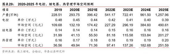 非电池产业链:结合上文我们对新能源汽车产量的预测,我们认为 2025 年电控、继电器、 热管理零部件领域市场空间分别达到 654、270、338 亿元。