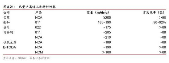 三元材料在总产能上供过于求,NCM523 及以下产品同质化很明显,盈利能力难提升。在 高镍产品开发策略方面国内企业各有不同,但盈利能力普遍高于普通三元产品。部分企业 以 622 为主(当升科技),部分企业跳过 622,直接开展 811 及更高镍含量材料开发(容 百科技)。由于高镍材料制造设备需求特殊,市场后入者在产线布局方面有一定的后发优 势。性能方面,根据公司官网披露,住友、TODA 国外已实现量产产品克容量 180-190mAh/g, 但基本不向国内大批量供货,国内部分产品已接近或超过国外水平。盈利能力方面,622、 811 产品盈利能力显著高于常规产品。