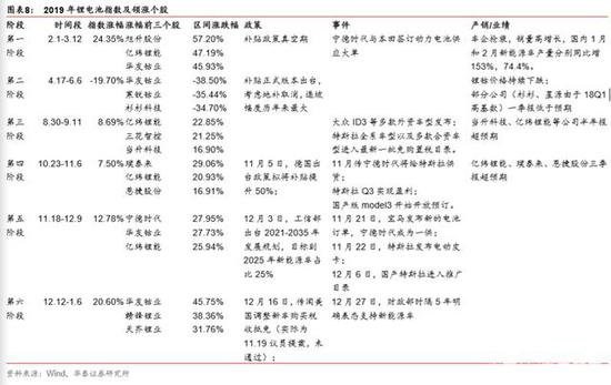 新能源汽车行业特点:政策夯实下限,需求决定上限。行业是嵌套着多个由于政策波 动带来的小周期的成长行业,产业链横跨有色(资源品)、化工(电池材料)、电力设备新 能源(电池/电机/电控/充电设施)、机械(设备)、电子(三小电)、汽车等行业,呈现高估 值/高波动属性,核心变量和行情催化剂包括鼓励政策、产业链数据、行业事件等。以 Wind 锂电池指数为例,2019 年板块相对收益最明显的三个时间段分别是 2 月、11 月和 12 月, 表现最好的个股分别集中在上游资源和中游电池。根据锂电池指数的复盘,我们认为鼓励 政策、行业事件、产销数据是影响行情的最主要因素,且影响依次递减。