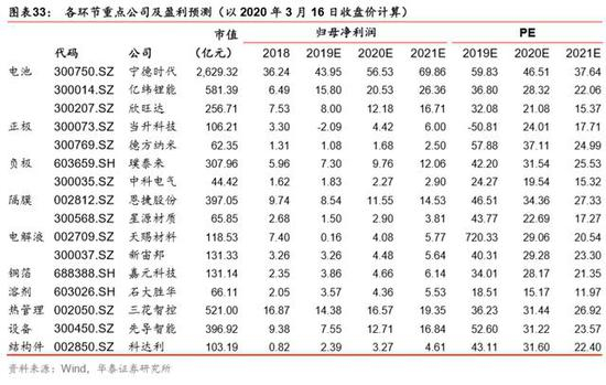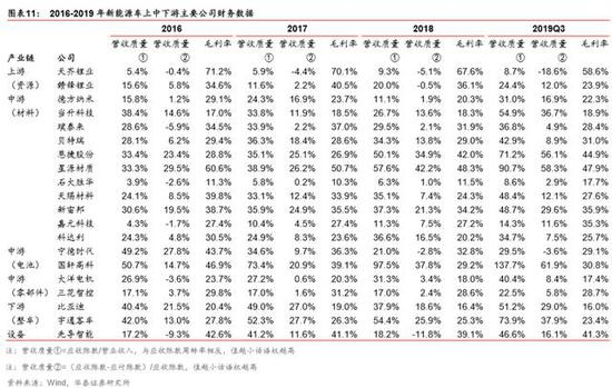 2011-2012 年光伏行业双反导致戴维斯双杀,2013 年市场回暖伊始,部分龙头公司(隆基股份、金风科技)最快在需求回升时实现利润的反转,股 价穿越牛熊市场。新能源汽车行业,2019 年业绩增速靠前的环节多为中游龙头,2019 年可能是新能源车中游业绩增速的最低点,中游龙头有望在2020 年随国内外需求快速提升迎来戴维斯双击。