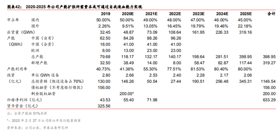 考虑公司在手货币资金、已进行的债权和股权融资、以及未来几年利润,我们测算得公司 能够覆盖潜在的资本开支,是整个产业链中唯一具备自我造血能力进行产能投资的动力电 池龙头。