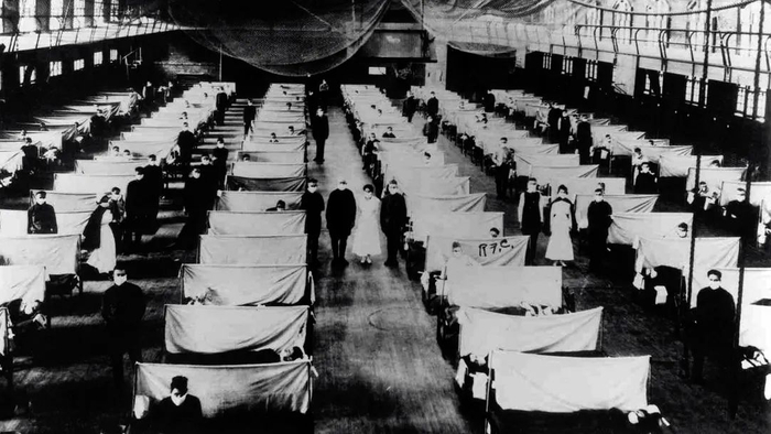 1918年,“西班牙大流感”爆发,为隔离受感染人员而改建的仓库。流感病毒也会在合餐时传播