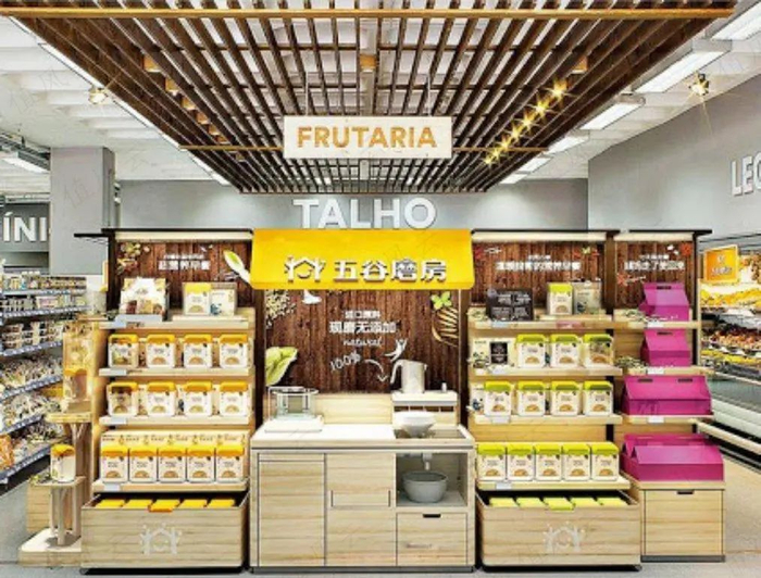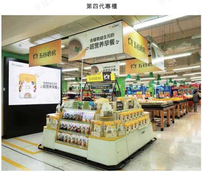 超市直营专柜,相当于超市的店中店,是一种设立在超市内部的直营店。五谷磨房目前已将专柜的外观造型设计,升级至第四代。