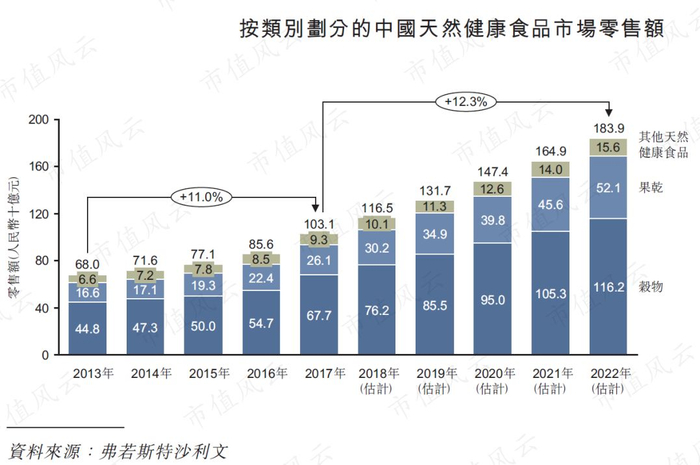 根据弗若斯特沙利文的报告,中国天然健康食品行业的零售额由2013年680亿元增至2017年的1031亿元,年复合增长率为11%。谷物类食品是中国天然健康食品的第一大类,占比接近70%。