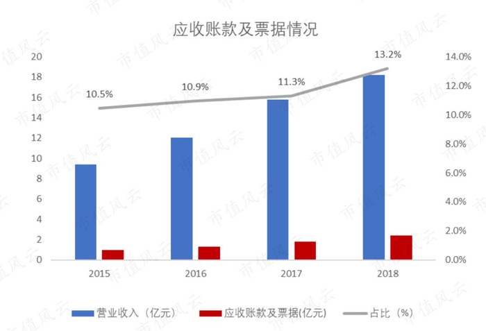 2015-2018年,应收账款及票据占营收的比例略有增长,不过比例只有10%左右,依然较低。