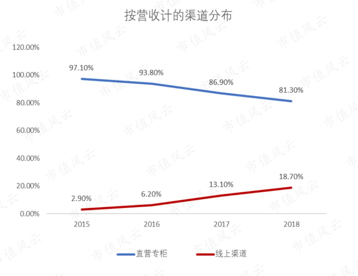 按收入计,2015-2018年线上渠道收入占比从2.9%增长至18.7%,线下直营专柜收入占比则从97.1%下降至81.3%。