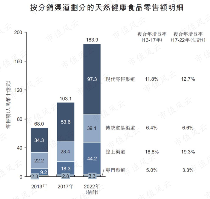 根据弗若斯特沙利文的资料,现代零售渠道贡献了天然健康食品市场总零售额的50%以上,超市和便利店依然是最主要的销售渠道。